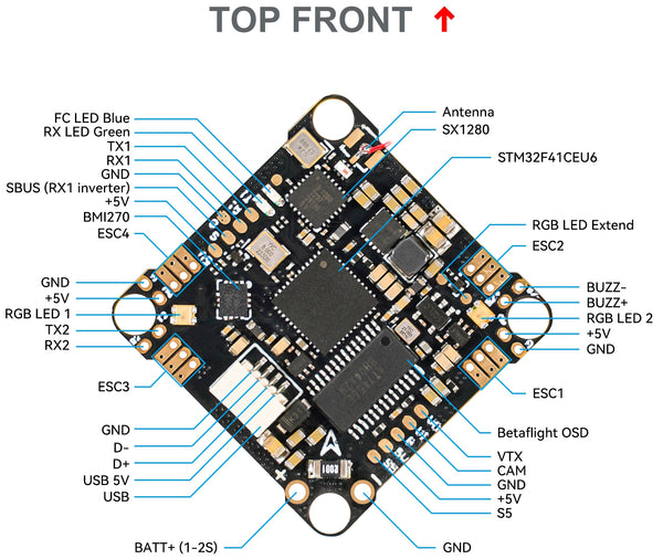 This board is designed for long-range 3inch ultralight toothpick drones or 2S whoop drones. If you want to try ExpressLRS on 65mm/75mm whoop drones, please build it with our F4 1S FC board with a built-in SPI ExpressLRS receiver.