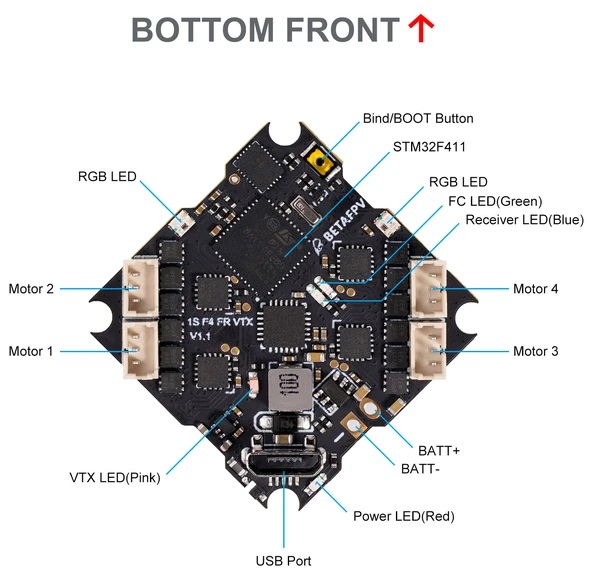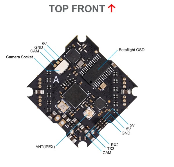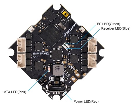 4 Indicators: Receiver indicator (Blue)/Flight control status indicator (Green)/Flight control power indicator (Red)/VTX indicator (Pink)